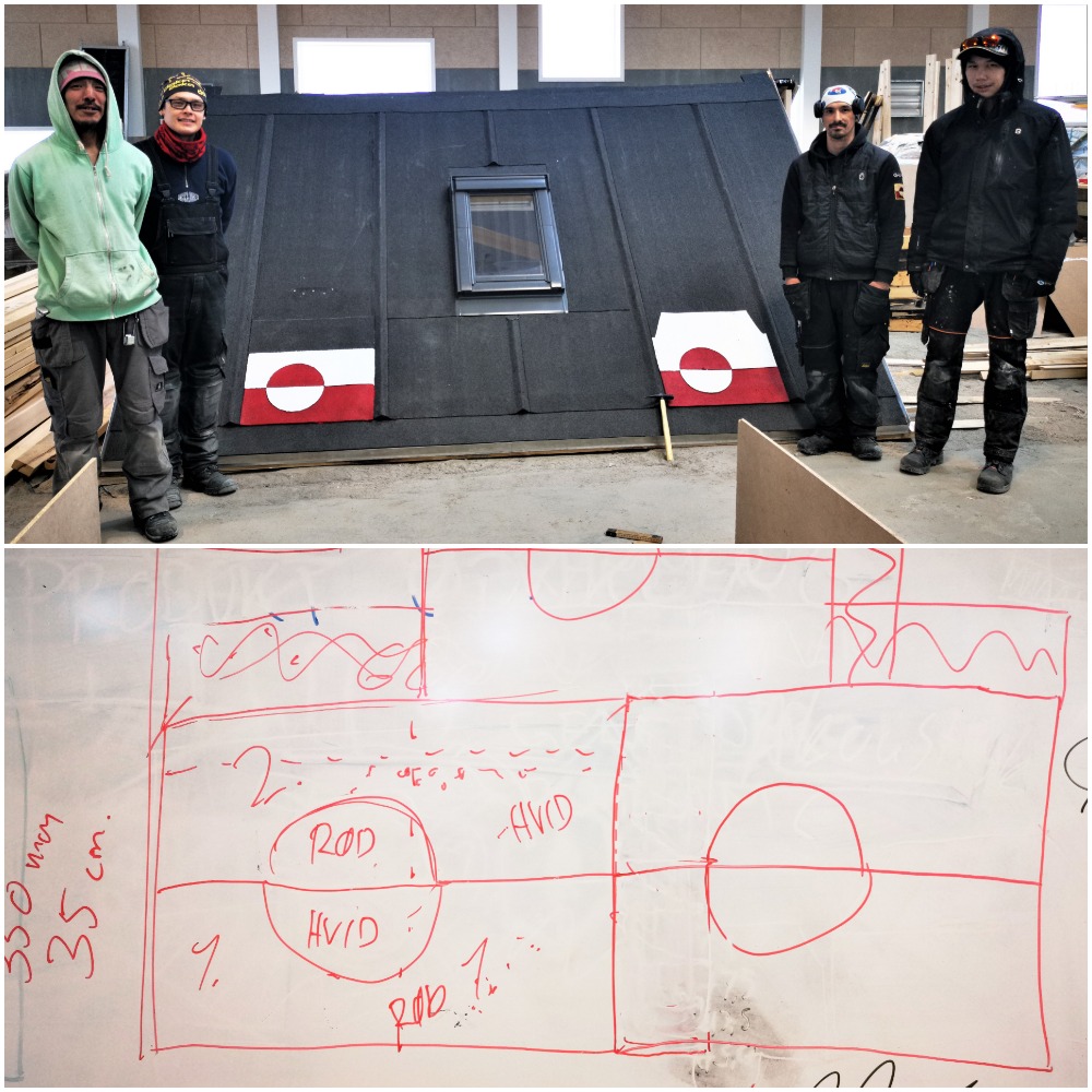 Som et nyt element på taget designede eleverne det grønlandsk flag i tagpap, og fæstnede de 2 flag på taget. Innovativt og flot!