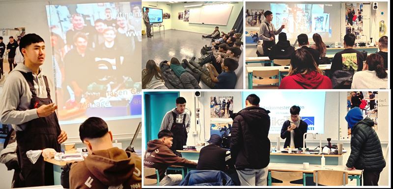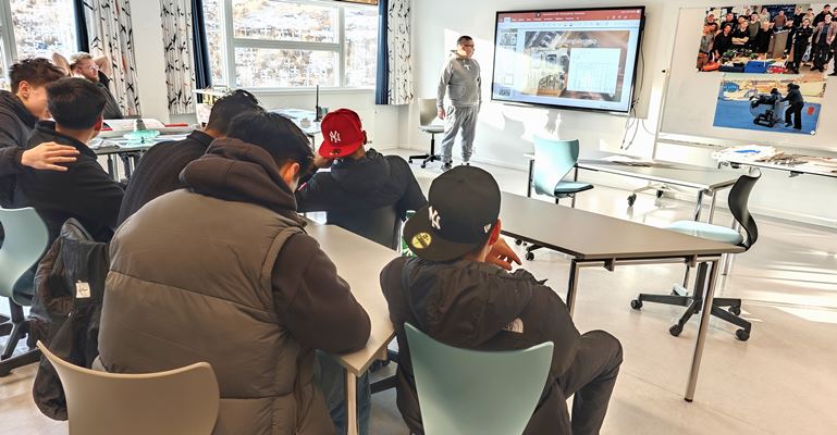 Masaatsiaq Rafaelsen, maskinmesterstuderende og praktikant giver kanonpræsentation om Sisimiut Maskinmester uddannelse i Aasiaat hos Atuarfik Gammeqarfik & Aasiaat GUX. Med sin egen flotte præsentation fortæller han om uddannelsen i 45 minutter (8 gange i alt) for gymnasieelever og folkeskoleelever. Der var god interesse for maskinmester.